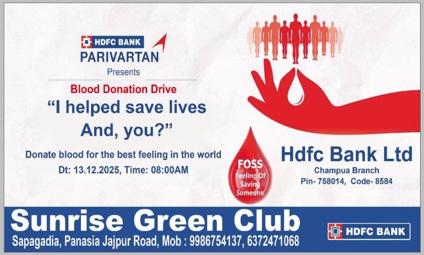 HDFC BANK ତରଫରୁ ୩୨ ୟୁନିଟ୍ ରକ୍ତ ସଂଗ୍ରହ. ବ୍ୟାସନଗର ୧୩/୧୨ ସାପଗଡିଆ ସ୍ଥିତ ସନରାଇଜ୍ ଗ୍ରିନ୍ କ୍ଲବ୍ ପକ୍ଷରୁ ଶନିବାର ଆୟୋଜିତ ଏକ ସ୍ବେଚ୍ଛାକୃତ ରକ୍ତଦାନ ଶିବିରରେ ୩୨ ୟୁନିଟ୍ ରକ୍ତ ସଂଗ୍ରହ କରାଯାଇଛି.